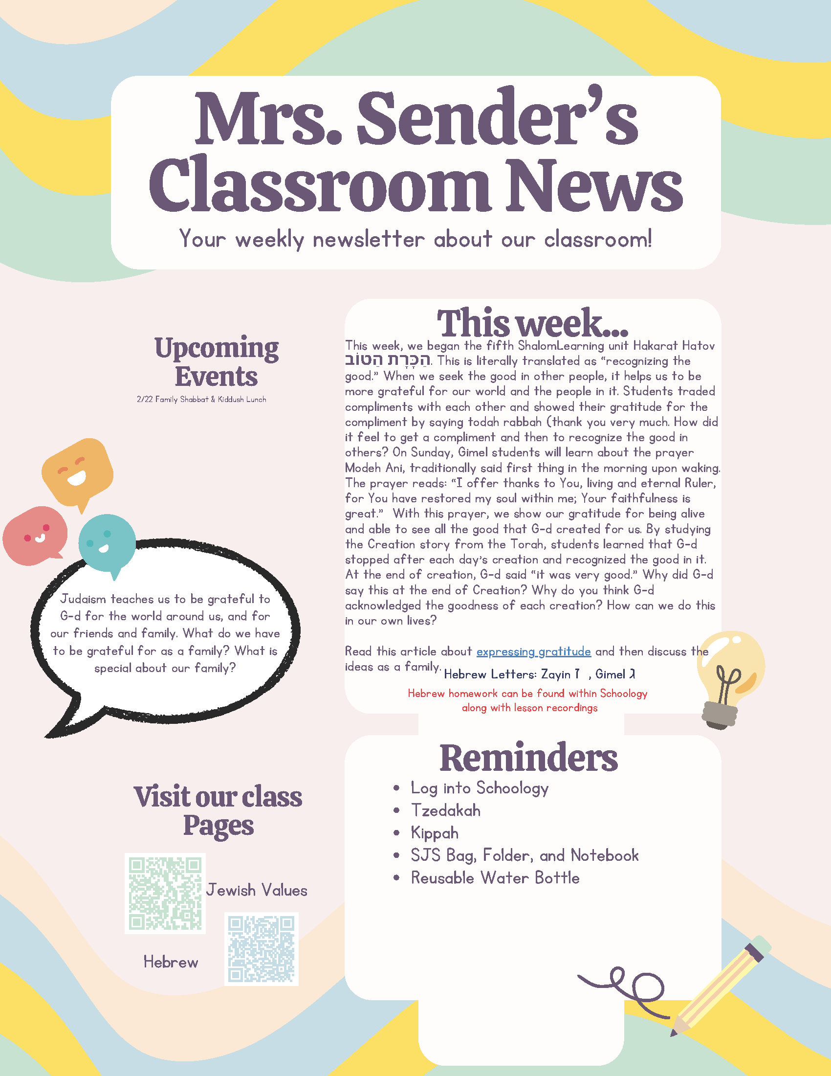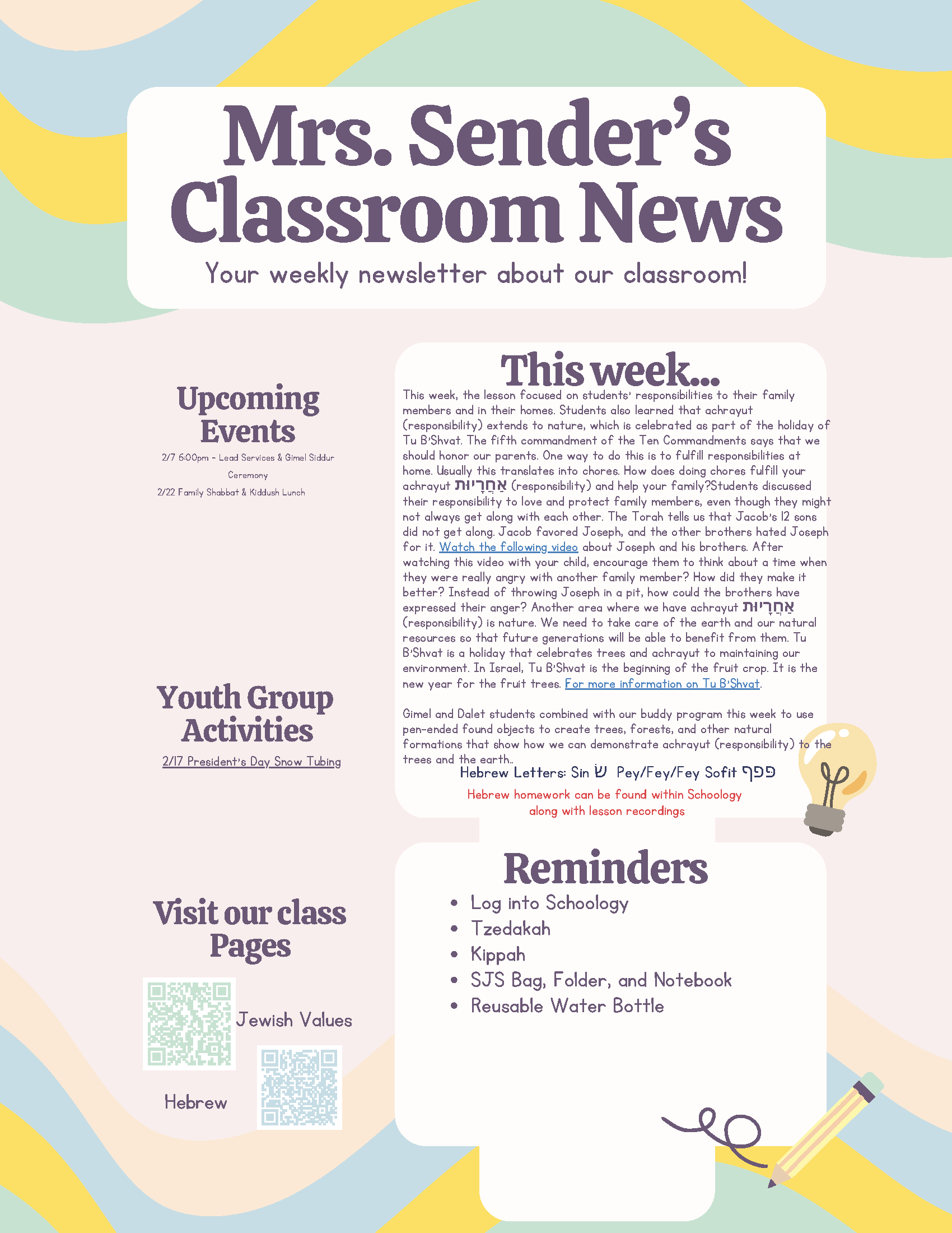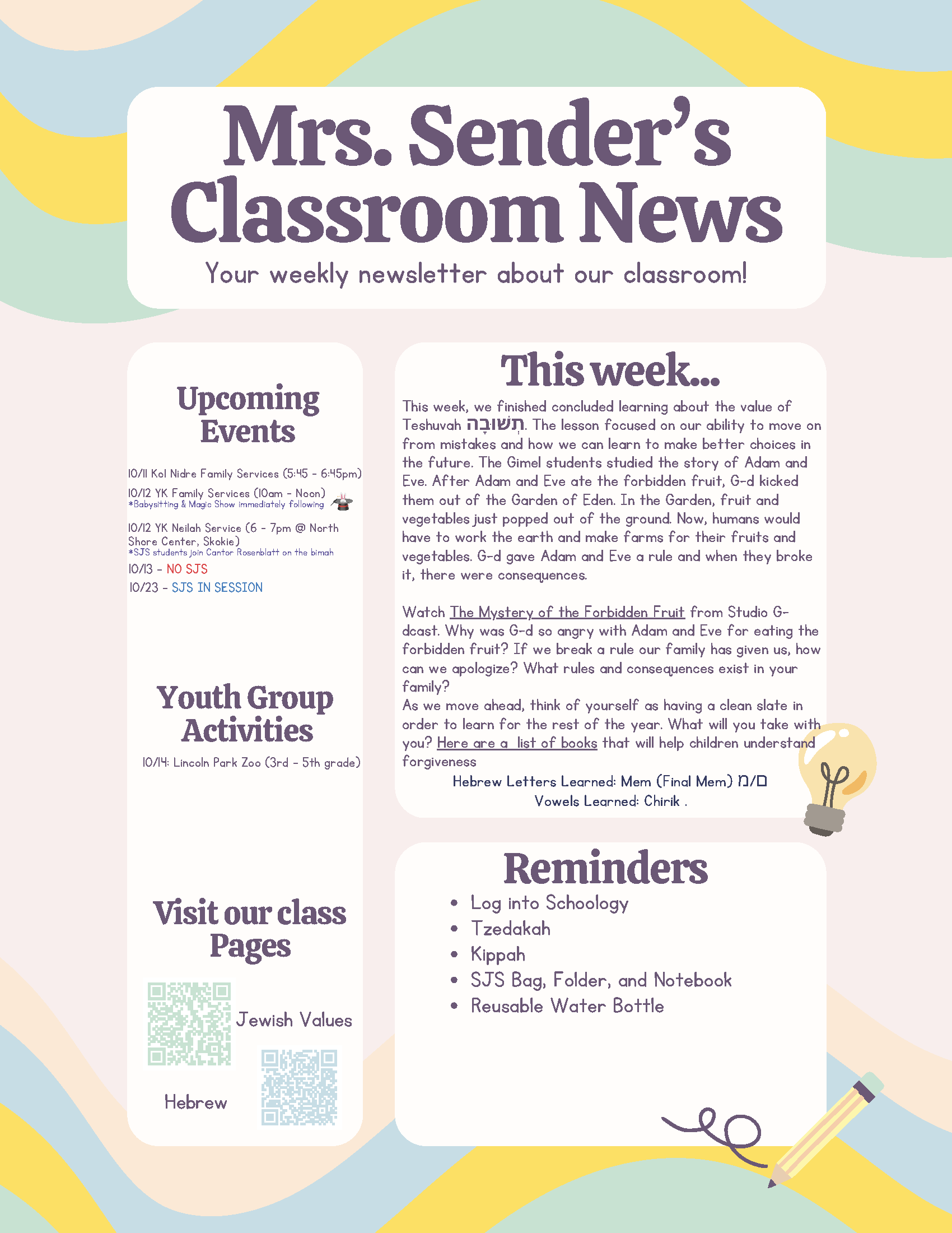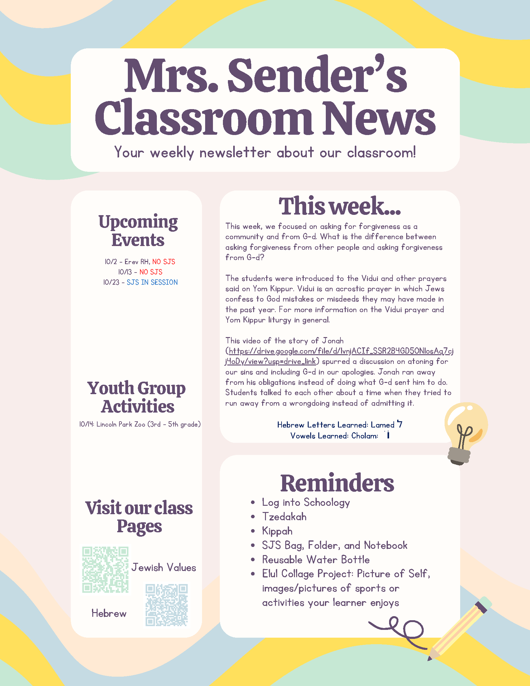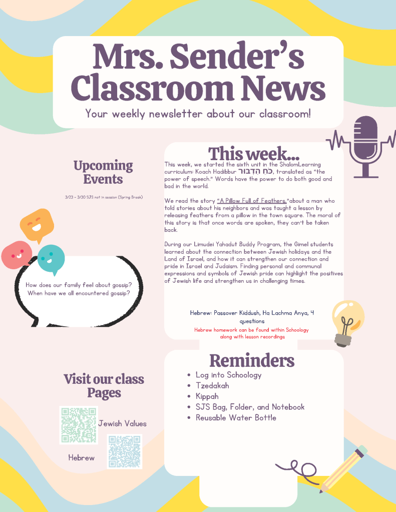 Teachers: Mrs. Shira Sender ssender@amyisrael.org and Morah Sarah Burnstein sburnstein712@gmail.com