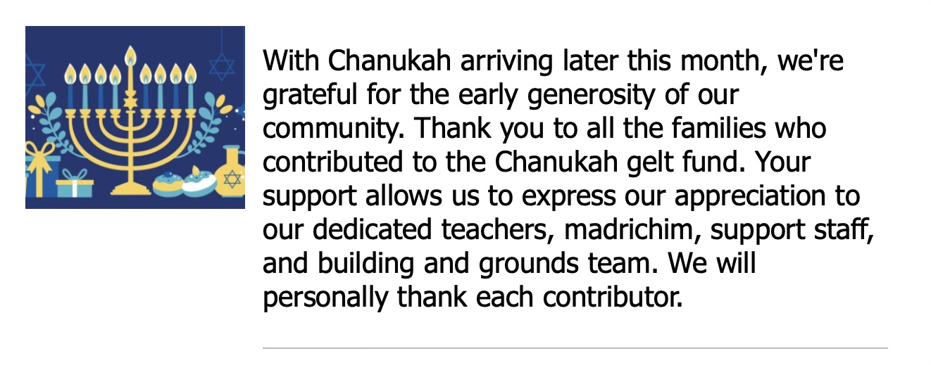 Please join us on Saturday, Dec 14th for Family Shabbat Service. Please click here for information and to RSVP. Kiddush Lunch is being co-sponsored by Mr. Sherman & Mr. Marc in honor of 15 years of leading Tefillah together at Am Yisrael.