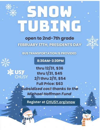 2nd-7th graders come spend your Presidents Day Off at CHUSY’s annual Snow Tubing event at Villa Olivia in Bartlett, IL!