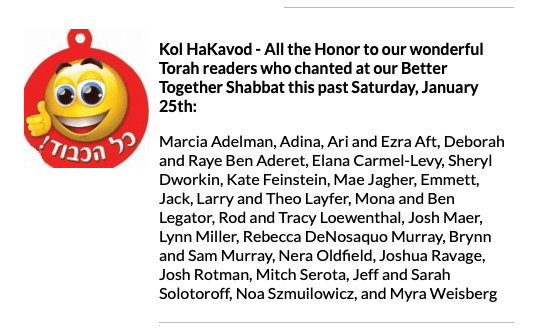 Join us for Better Together Family Shabbat, a wonderful opportunity for K–12 families (and younger siblings) and congregants to connect and celebrate Jewish life, prayer, and learning. We warmly invite you and your loved ones to a family-friendly Shabbat service featuring intergenerational Torah reading, followed by a Kiddush lunch. Please RSVP here if you haven’t already. Family Shabbat is co-sponsored by our Better Together Grant.