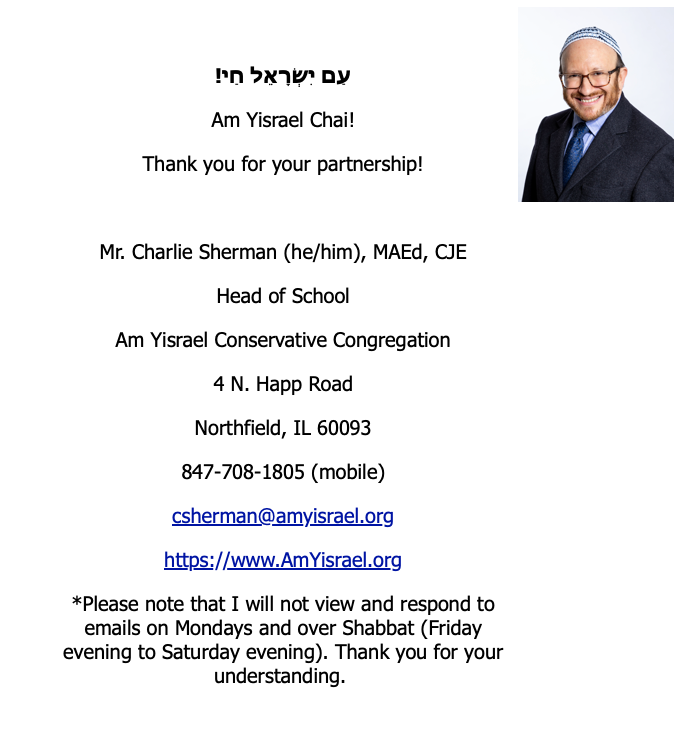 Dear Am Yisrael SJS & Day School Families, Students, Madrichim, Teachers, and Staff,