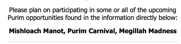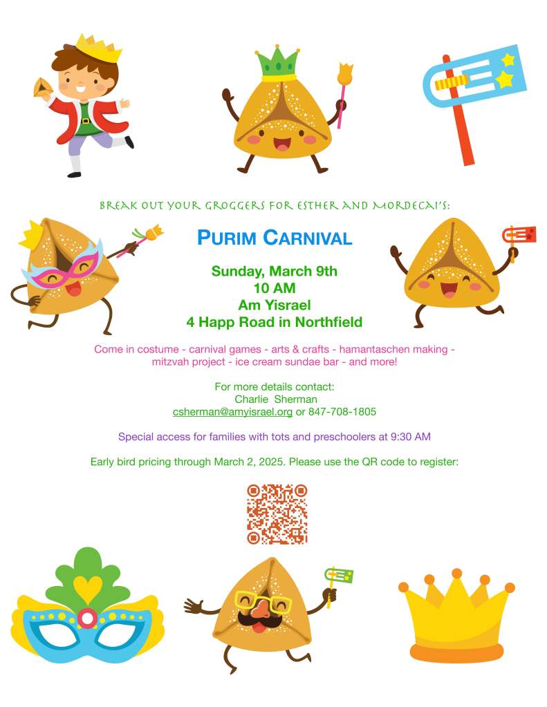 Purim Carnival Early Bird Pricing Registration through March 2 via this link https://forms.gle/y3nUpYku9gGHh9mm6 or QR code in flyer directly below.