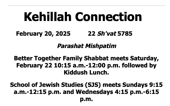 Join us for Better Together Family Shabbat! This is a wonderful opportunity for families with children in grades K-12 (and younger siblings), along with other congregants, to connect and celebrate Jewish life through prayer and learning. We warmly invite you, your family, friends, and anyone looking for a family-friendly Shabbat service. The service will feature intergenerational Torah reading, followed by a Kiddush lunch. Please RSVP here [link] if you haven’t already. Family Shabbat is co-sponsored by our Better Together Grant. Please click here to RSVP by February 24th.