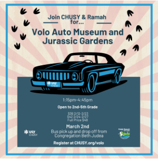 Join Ramah and CHUSY at the Volo Auto Museum and Jurassic Gardens on March 2nd! Check out classic and iconic cars like the Batmobile, The Mystery Machine, and James Bond’s Aston Martin! Explore the Jurassic Gardens featuring over 45 life-like dinosaurs and play at the Dino-themed arcade. Engage in an Israel-Themed scavenger hunt as you explore the museum! Transportation provided from Congregation Beth Judea. Sign up at CHUSY.org/volo