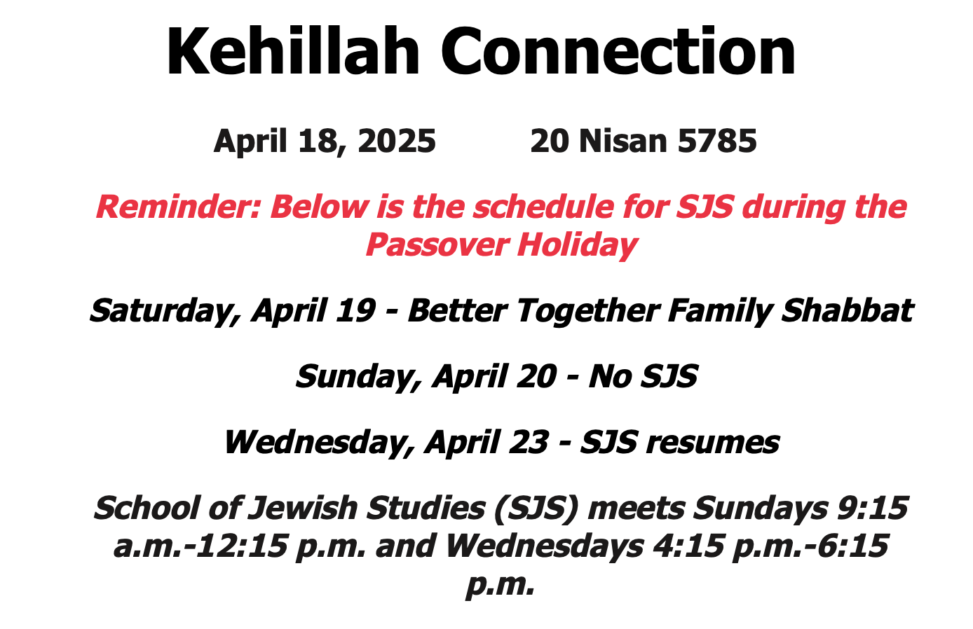 We invite all families with K-12th grade students at SJS or our local Jewish Day Schools to join us for special Shabbat services on Friday, April 25th. We’ll be honoring families with English readings, and students and madrichim will have opportunities to help lead these family-friendly services. Services begin at 6:00 p.m. and will conclude by 6:50 p.m.