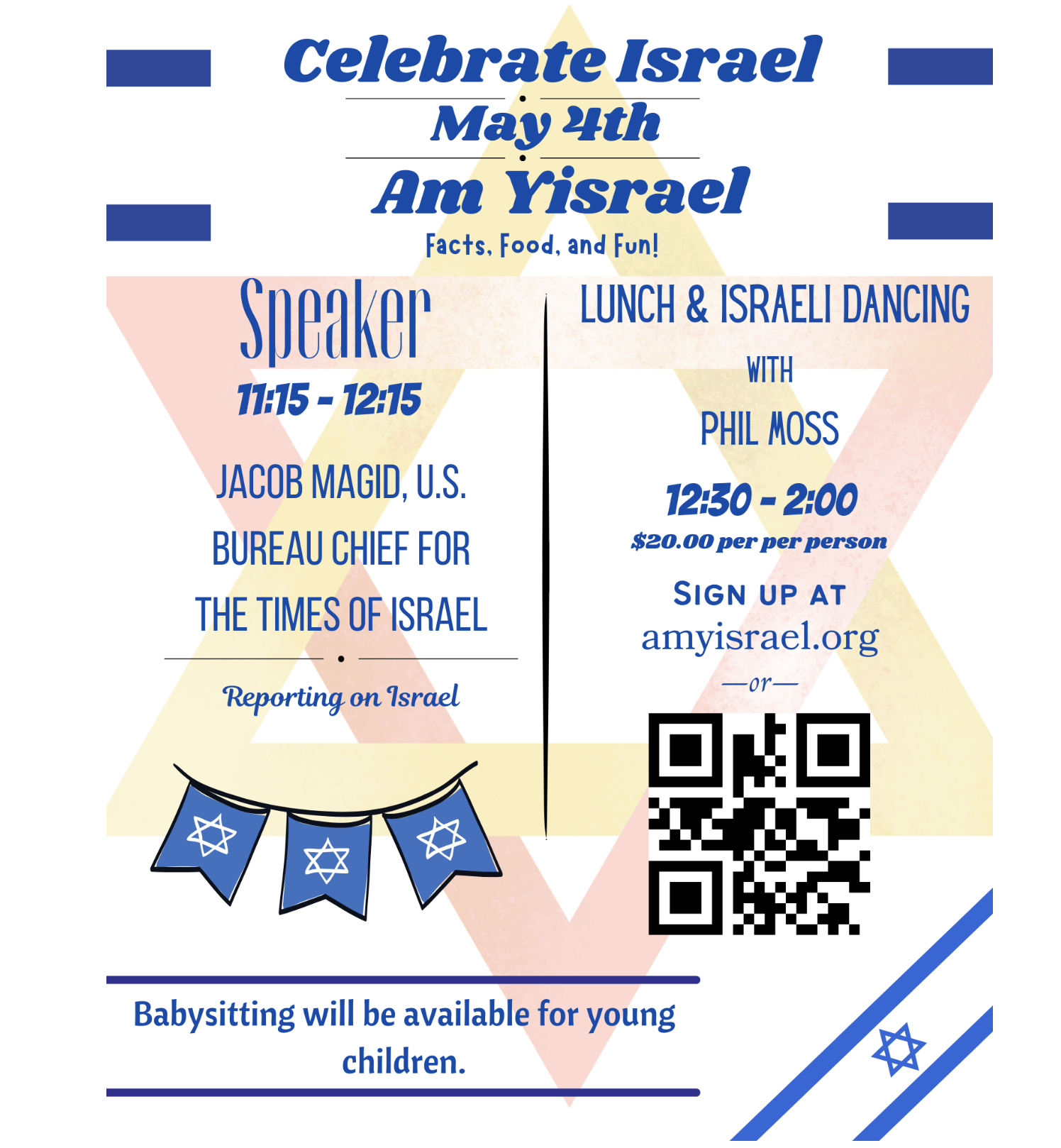AMUSY Lounge NightOur next social get together for 4th-12th Graders is happening on Wednesday, April 23 from 6:30 p.m.-8:30 p.m. Please RSVP here or via the QR code in the flyer.Please contribute $18 to cover the cost of our kosher dinner either via Zelle (through your bank), entering this special email address: (deposit@amyisrael.org Memo: AMUSY Lounge), by check (made out to Am Yisrael) or with cash (envelope to Mr. Sherman’s attention).