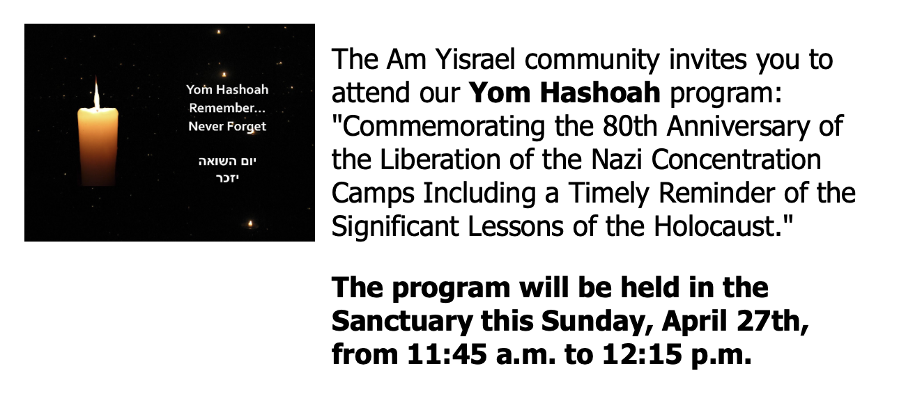 Just a friendly reminder that Am Yisrael holds Shabbat Services every Friday evening and Shabbat morning. This Friday, April 25th, is one of our services specially geared towards families!