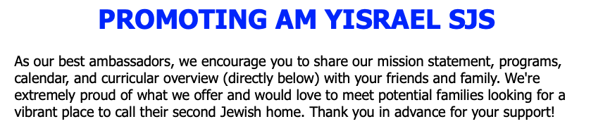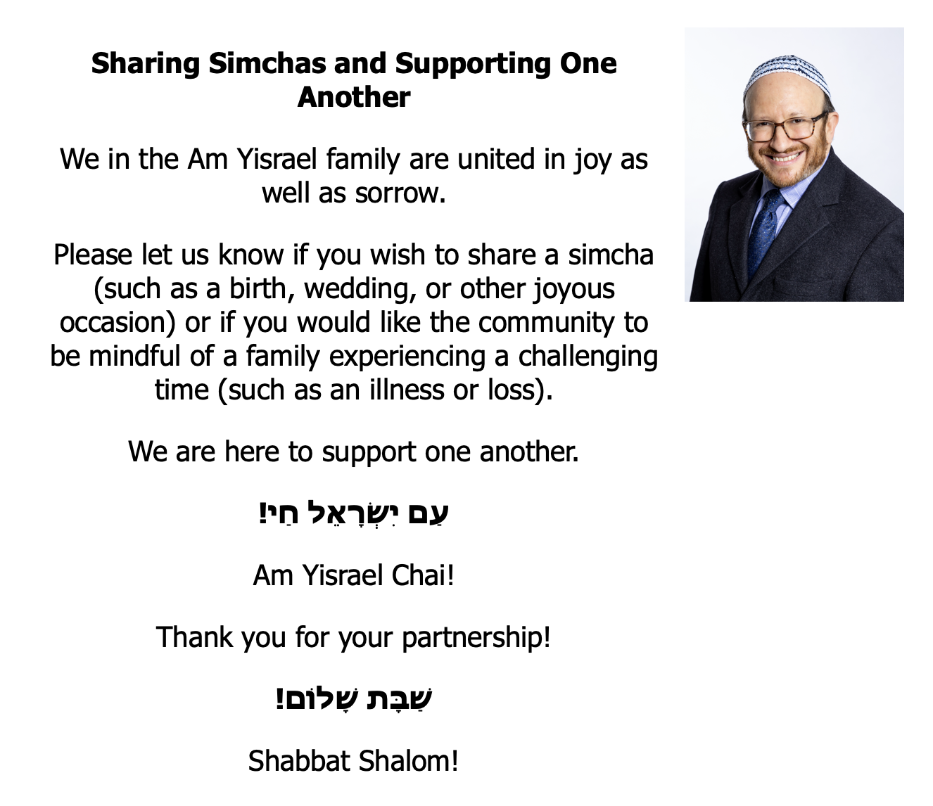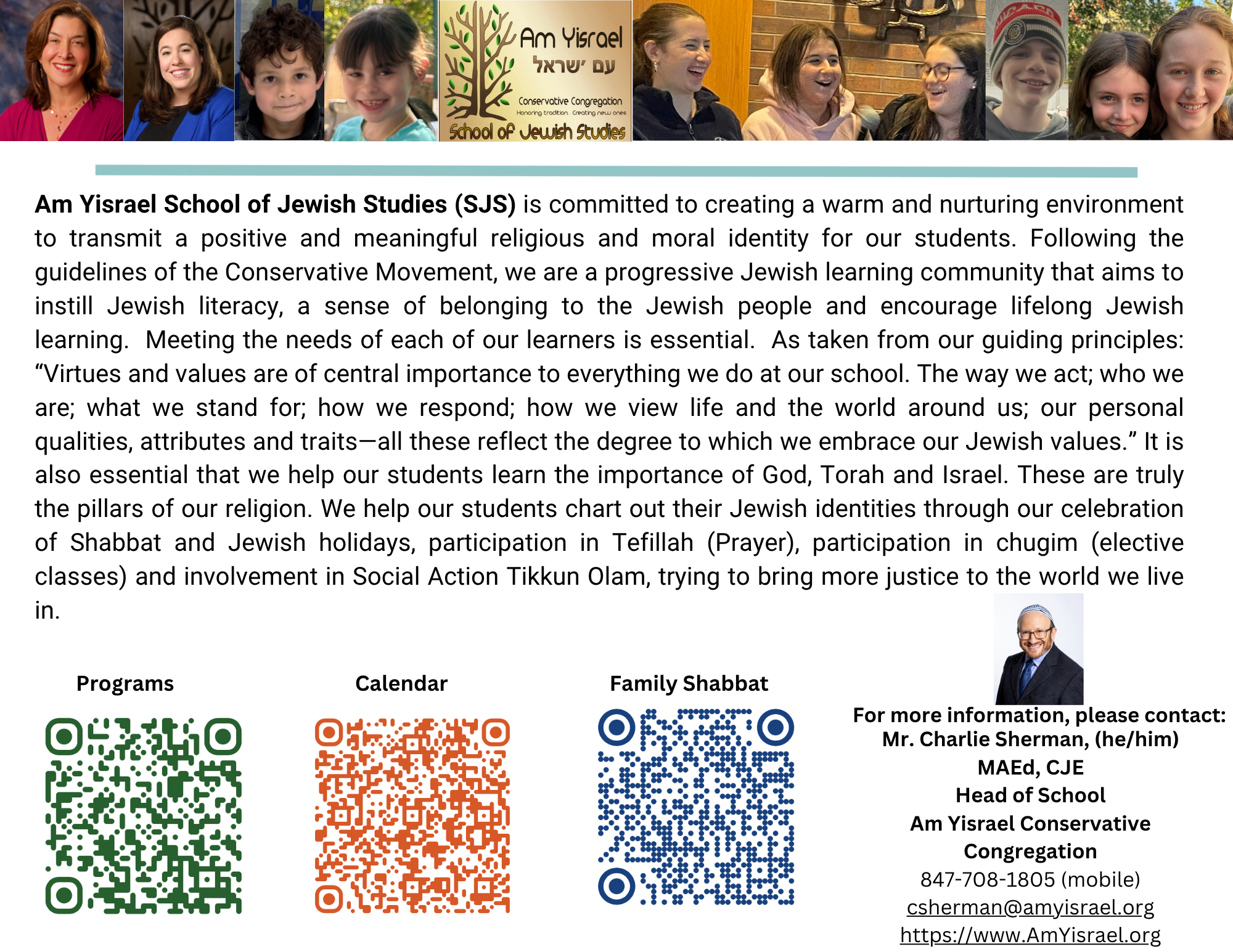 While the 2024-2025 school year is now complete, we look forward to seeing you on Shabbat, Shavuot, at Am Yisrael Palooza events, Family Promise and other times throughout the upcoming months!