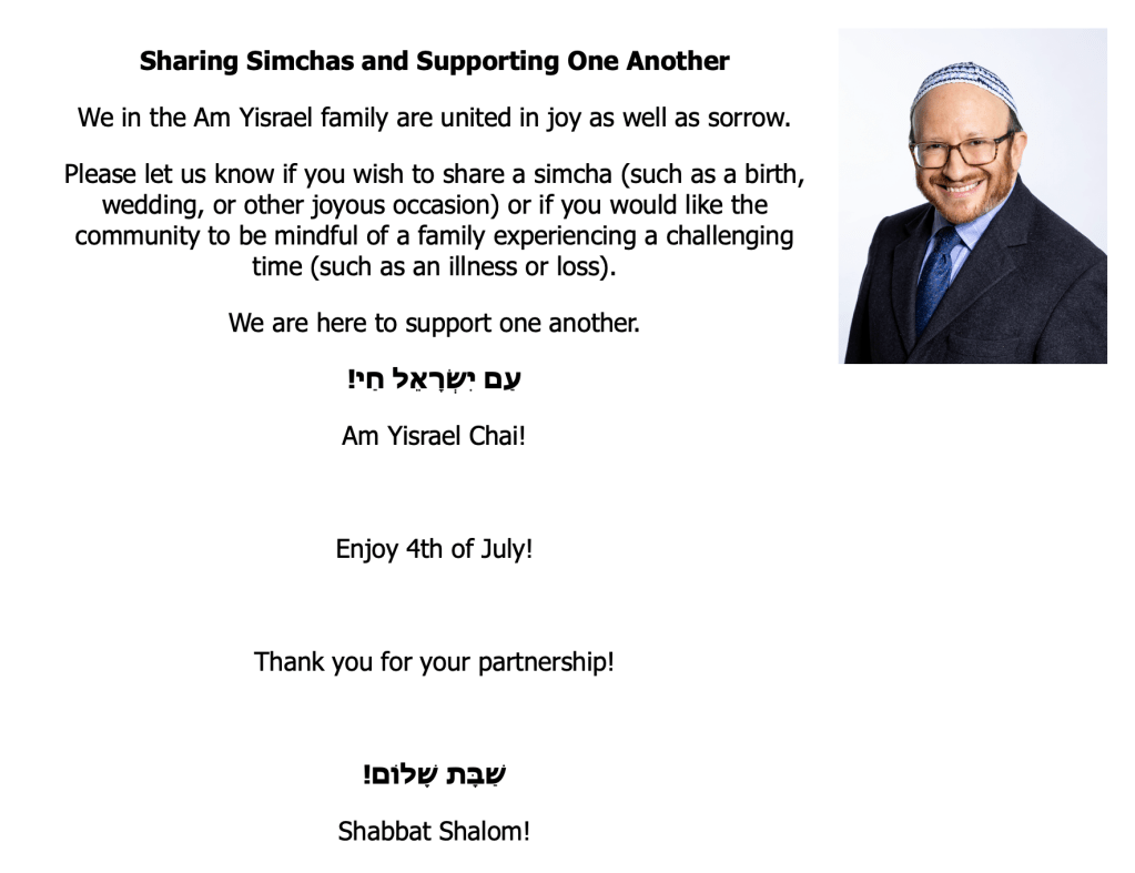 While the 2024-2025 school year is now complete, we look forward to seeing you on Shabbat, Shavuot, at Am Yisrael Palooza events, Family Promise and other times throughout the upcoming months!