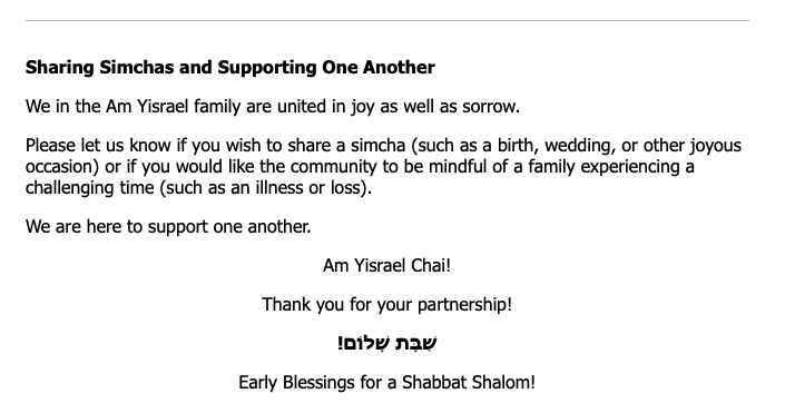 On behalf of our engagement committee, please complete this survey to let us know what programs, classes and activities you’re interested in participating in at/with Am Yisrael. We can’t wait to hear from you!