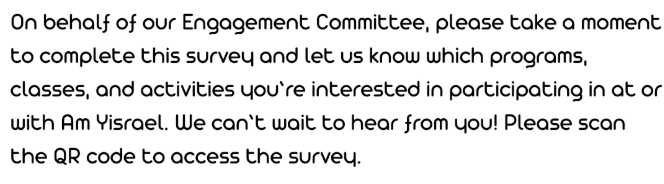 We in the Am Yisrael family are united in joy as well as sorrow. Please let us know if you wish to share a simcha (such as a birth, wedding, or other joyous occasion) or if you would like the community to be mindful of a family experiencing a challenging time (such as an illness or loss). We are here to support one another.