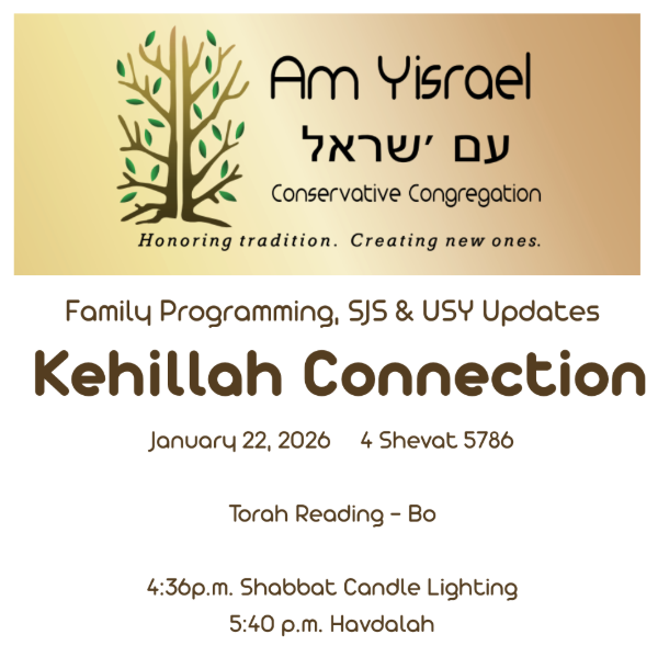 We in the Am Yisrael family are united in joy as well as sorrow. Please let us know if you wish to share a simcha (such as a birth, wedding, or other joyous occasion) or if you would like the community to be mindful of a family experiencing a challenging time (such as an illness or loss). We are here to support one another.